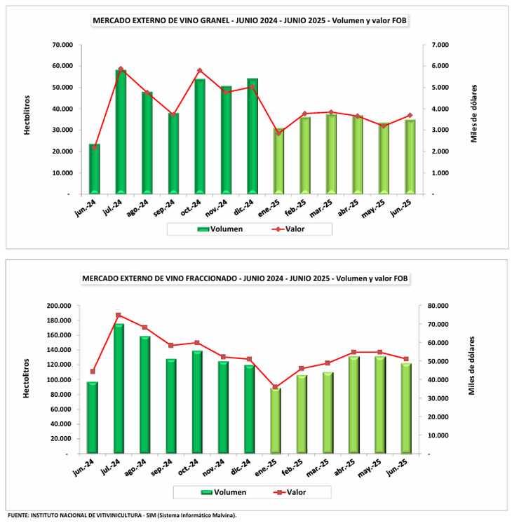 Sin embargo, a pesar de los datos mensuales positivos de junio, el valor FOB total acumulado de vinos y mostos de enero a junio de 2025 registró una ligera disminución del 0,9%, totalizando 369.935 miles de dólares, en comparación con los 373.420 miles de dólares del mismo período en 2024. Las exportaciones de vinos acumuladas disminuyeron un 2,1%, mientras que las de mosto (concentrado y sulfitado) aumentaron un 5,8%.
