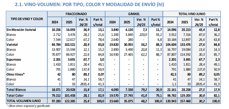Dentro del segmento de vinos, el vino fraccionado lideró el crecimiento en volumen con un aumento del 25,8% (122.385 hl), mientras que el vino a granel mostró un impresionante crecimiento del 48,2% (35.075 hl). Por tipo de vino, el vino color (tinto/rosado) impulsó el crecimiento general con un aumento del 30,8% en volumen (129.203 hl), y el vino blanco creció un 27,5% (28.258 hl).