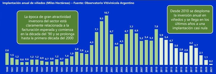 El informe también refiere a la evolución de las inversiones en viñedos desde la década del´90 cuando comienza una gran atractividad inversora del sector que está claramente relacionada a la facturación esperada, esa etapa se prolonga hasta la primera década del 2000. Es a partir de 2010 cuando se desploma la inversión anual en viñedos y se llega en los últimos años a una implantación casi nula.