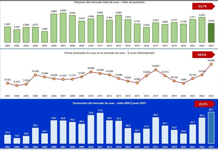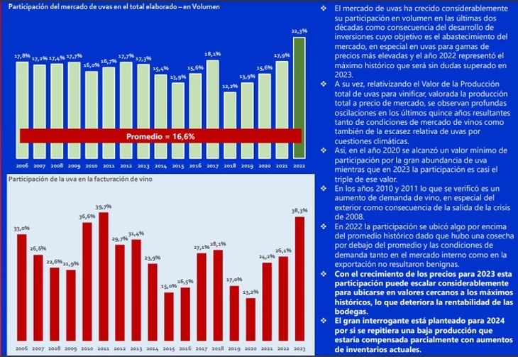 En 2023, el mercado se ha caracterizado por una sustancial caída de volumen y un significativo aumento de precios. Esta característica está asociada a una gran presión de oferta que terminó elevando la facturación. El resultado de la mala cosecha actual -según indican en el informe presentado- aumentará con seguridad los costos de producción de vinos que difícilmente las bodegas puedan trasmitir al precio final del producto.