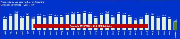 Según explicó el economista, la cosecha de uvas de 2023 fue la más baja en décadas, resultado que estuvo directamente relacionado a eventos climáticos excepcionales, equivalentes a los que se observan en distintas regiones del planeta -competidoras en el mercado global de vinos- lo que otorga una cuota de incertidumbre hacia el futuro por la repetición de su ocurrencia.