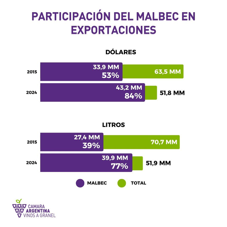Sin embargo, los datos recientes de la Cámara Argentina de Vinos a Granel (CAVG) y otras fuentes como CIATTI revelan una situación que merece un análisis detallado: mientras el Malbec sigue dominando con el 82% de las exportaciones a granel, también experimenta una leve, pero persistente, caída en sus volúmenes de despacho.