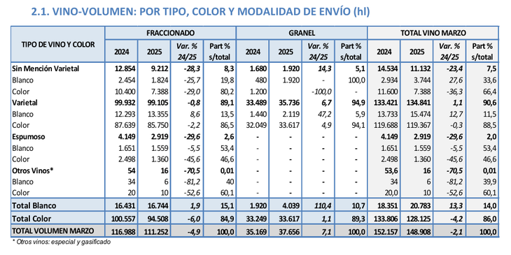 De este total exportado, 30,8 millones de litros (74,5%) corresponden a vinos fraccionados, que experimentaron una baja del 3,1%, mientras que los vinos a granel alcanzaron 10,5 millones de litros (25,5%), con una caída más pronunciada del 4,8%.
