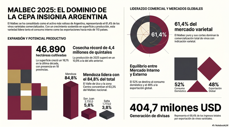 El Malbec no solo es la variedad más plantada de Argentina, sino también la que más crece. Los datos del Instituto Nacional de Vitivinicultura (INV) al cierre de 2025 lo confirman con contundencia: 46.890 hectáreas cultivadas en todo el país, una producción de 4.461.646 quintales y una participación del 61,4% en el total de vinos varietales comercializados. Las cifras consolidan a esta uva de origen francés como el activo más valioso de la vitivinicultura nacional.