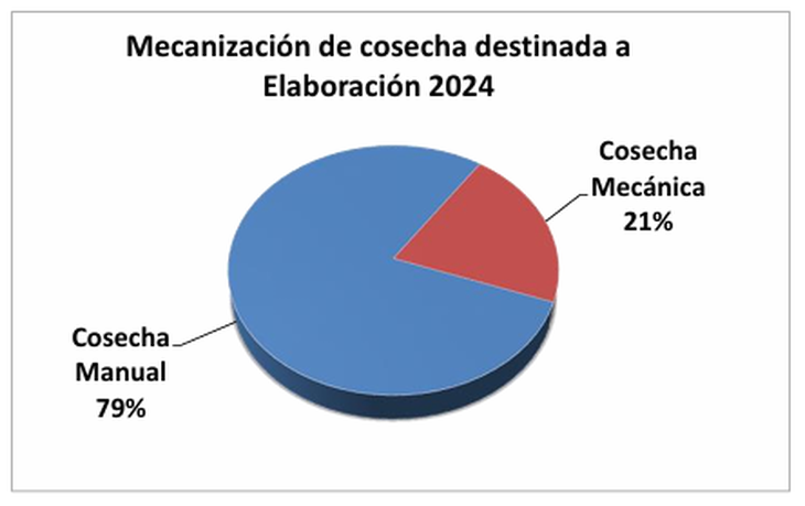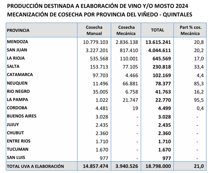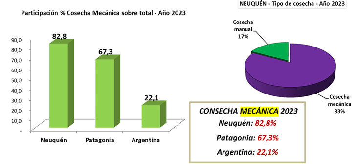 De acuerdo a informes del Instituto Nacional de Vitivinicultura (INV), el departamento de Añelo lidera con un 86,1% en 2024 y 83,6% en 2023, mientras que Confluencia registra 62,3% en 2024 y 61,4% en 2023. Este liderazgo contrasta fuertemente con el promedio nacional, que en 2024 fue solo del 21%. Incluso provincias tradicionales como Mendoza y San Juan muestran tasas mucho más bajas (20,8% y 20,2% respectivamente), debido a la predominancia de viñedos antiguos no adaptados a la maquinaria.