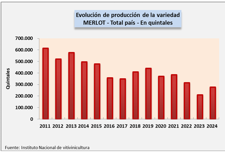 De acuerdo a datos del Instituto Nacional de Vitivinicultura (INV), la producción total en el país de la variedad Merlot en 2024 fue de 278.559 quintales. La tendencia ha sido descendente en los últimos años, bajó un 42% desde el 2015. En 2024 la variedad aumentó un 32% en relación con el año anterior.