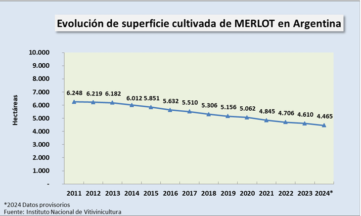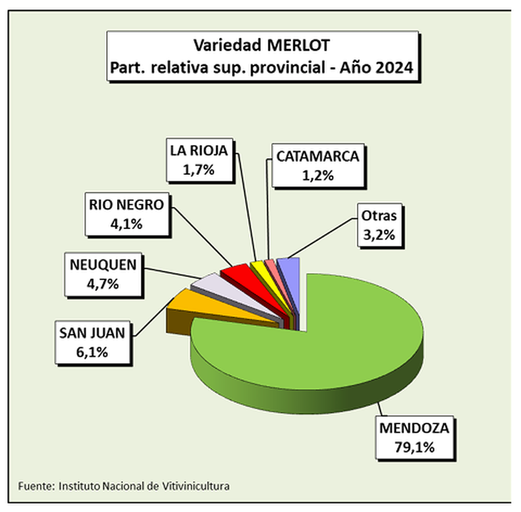 La provincia de Mendoza tiene la mayor cantidad de Merlot del país, alcanzando en 2024 las 3.530 ha (79,1%), seguida por San Juan con 273 ha (6,1%) y el resto de las provincias con 661 ha (14,8%)