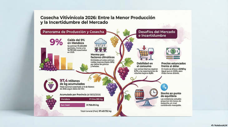 El avance de la Vendimia 2026 en Argentina revela una geografía productiva con realidades contrastantes. Según el informe del Instituto Nacional de Vitivinicultura (INV) correspondiente a la semana 10 del proceso de elaboración (con datos acumulados al 8 de febrero de 2026), el país ha registrado un ingreso total de 97.431.752 kilogramos de uva.