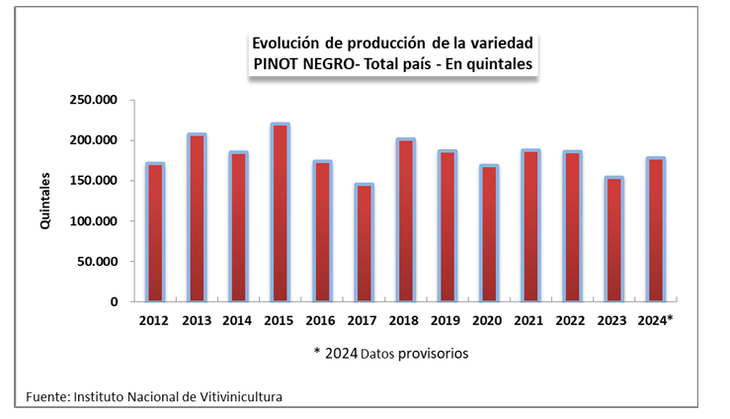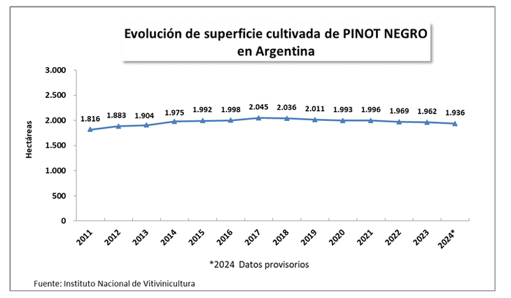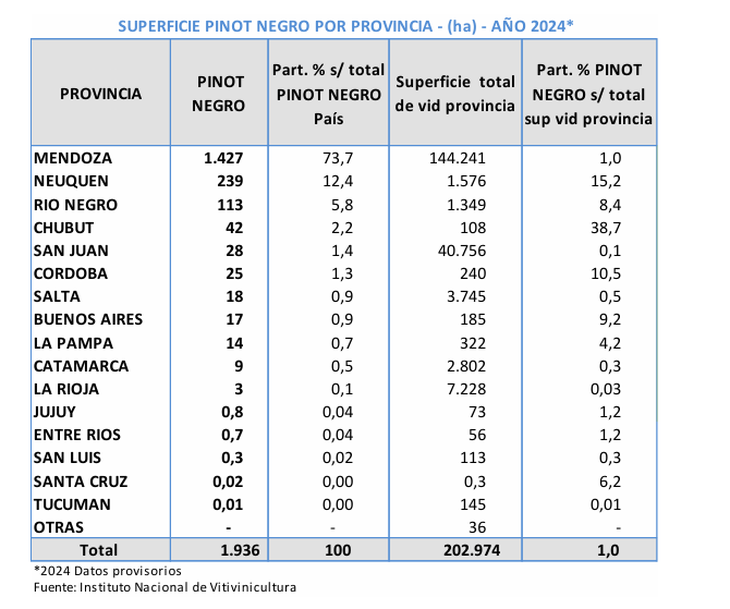 El Pinot está presente en 16 provincias de Argentina. En el año 2024 registró un total de 1.936 ha cultivadas, lo cual representa el 1% del total de vid del país. Está en el puesto 18° en el total de variedades.