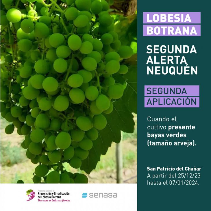 El Servicio Nacional de Sanidad y Calidad Agroalimentaria (Senasa) recuerda que ya está vigente la segunda alerta fitosanitaria para el control químico/biológico de la polilla de la vid, plaga que afecta los cultivos de uva en la provincia de Neuquén.