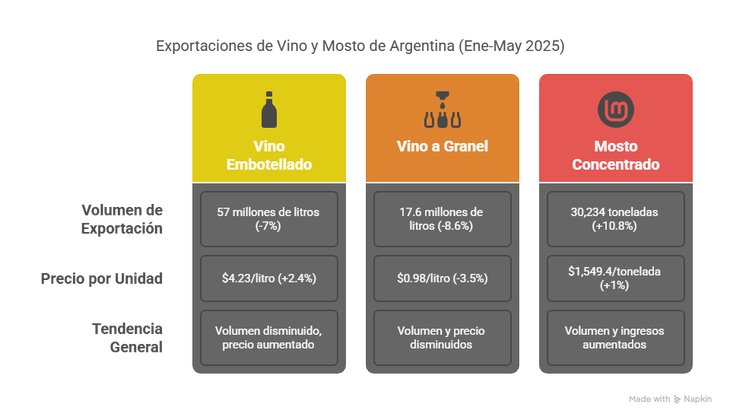 En cuanto al mosto concentrado, las exportaciones crecieron un sólido 5,3% en volumen. Sin embargo, es importante destacar que su valor FOB disminuyó un 4,7%, lo que podría indicar presiones en los precios internacionales y un desafío para la rentabilidad a pesar del aumento en el volumen comercializado.