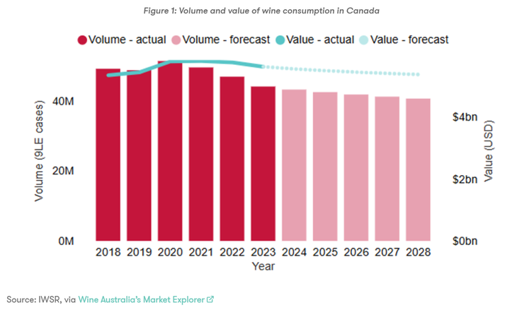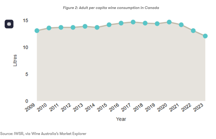 El amor por el vino en Canadá está en pausa. En 2023, se vendieron 44 millones de cajas por un valor de 5.600 millones de dólares, pero el volumen cayó un 6%. ¿Las razones? Preocupaciones por la salud y el aumento del costo de vida. El consumo per cápita pasó de 14,2 litros por adulto en 2021 a 12,1 en 2023, una baja del 8% anual.