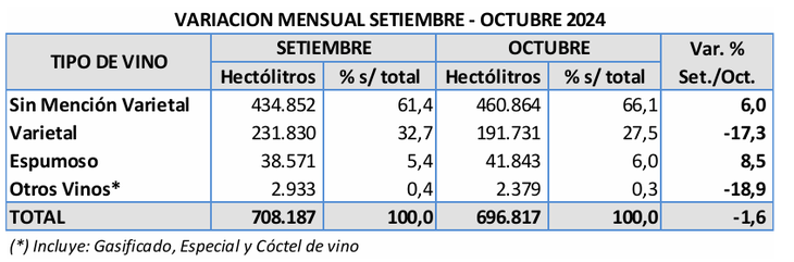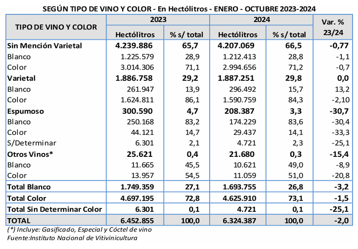 Si vamos al acumulado entre enero y octubre de este año comparado con lo sucedido en el mismo periodo de 2023, de acuerdo al informe del INV, el único segmento que se salva de la baja es el de los vinos varietales, que no presentó variaciones significativas con lo comercializado el año anterior. En tanto, los sin mención varietal, el 66,5% de lo que se vende en el país, tuvo una leve baja del 0,77%.