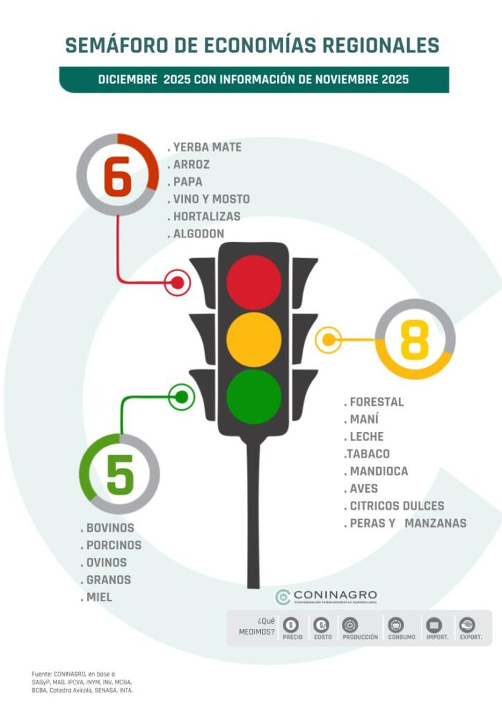 El Semáforo de Economías Regionales que elabora mensualmente Coninagro volvió a encender luces de alarma para la vitivinicultura argentina. Durante noviembre de 2025, la actividad vino y mosto se mantuvo en zona roja junto a otras cinco producciones: yerba mate, arroz, papa, hortalizas y algodón. Este color indica una situación crítica en al menos dos de los tres componentes analizados: negocio, productivo y mercado.